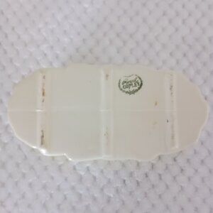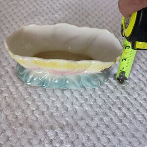 Mid-century, most likely from the 1940's or 1950's. The planter is approximately 7" in length and 3" tall and 3" wide. The colors are a greenish blue, pink and yellow. The inside is a cream color. It still has a Royal Copley sticker on the front and a stamp on the bottom as seen in photos 2 & 3 above.