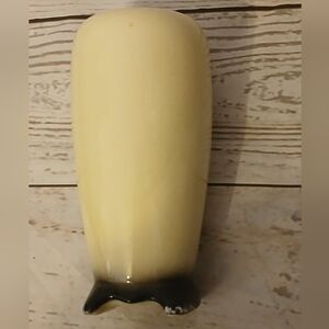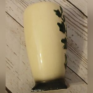 Elegant cream vase featuring a green ivy design. Perfect for home decor. 7 inches by 3 inches. Has a couple of small chips.