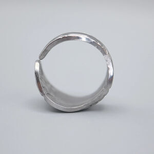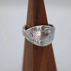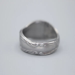 Handmade from a vintage stainless steel spoon. I cut, filed, shaped, and polished here. Feel free to ask questions about details regarding this ring.