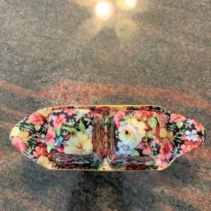 Beautiful set with its black background and masses of colorful flowers! Goldinger created beautiful reproductions in the 80's and 90's of original chintz work. Both stoppers still intact, clean set. White spots/lines are glare from lights. Measures approx. 2.75" high, tray 6". Excellent condition. *Color may vary slightly from pictures.