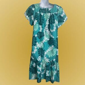 Royal Creations Hawaiian Poly mu'u·mu'u Dress Medium Green White size Medium with hidden back zipper. Cool easy care washable fabric. This has no tag but is new and Smoke free.