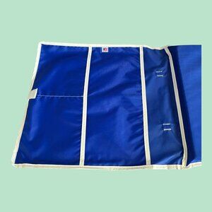 This is an RC Cola stadium seat cushion. The piece is blue with white details and the RC logo printed on the front flap. The cushion measures about 12" by 12". There is a handle on the top for carrying. The flap has "RC" on one side and pockets on the other. The pockets are positioned so that if you have the flap hanging in front or behind your seat, they can hold small objects. There is also a suction cup to help the cushion stay attached to your seat if it is made of smooth material. The piece is in great shape and seems barely used. It is super clean and without any defects. Please zoom in on photos for full conditioning details.