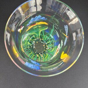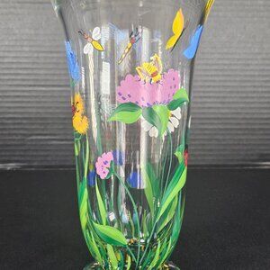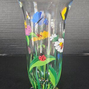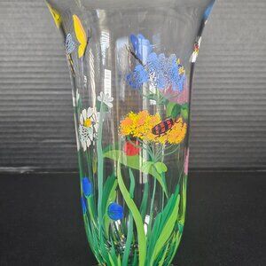 A very pretty Royal Danube art glass vase made in Romania. The hand blown and hand painted clear vase features a gorgeous array of garden flowers and insects. There are dragonflies, butterflies, ladybugs, beetles and bees. Multicolor flowers surround the entire vase. The heavy thick foot of this vase has multi colored glass flecks in the actual glass itself. The flared top of the vase is 5 5/8 inches in diameter. Base measures 10 1/4 inches tall and the base is 3 1/2 inches in diameter. This piece is wonderful piece to display with or without flowers. In excellent pre-owned condition. Original label on the base is gone. Non smoking pet free home. @ ER NW Boxed