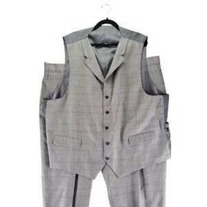 Sophisticated three-piece suit with a gray plaid pattern, perfect for formal occasions. Expertly tailored to provide a refined appearance and comfortable fit, ideal for those who appreciate classic style.