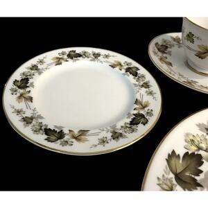 • Elevate your dining experience with this elegant vintage fine china place setting, featuring a classic design of fall leaves and delicate florals in soft green and beige hues. The gold trim adds a refined touch, making it ideal for formal dining, holiday gatherings, or as a timeless addition to your china cabinet.