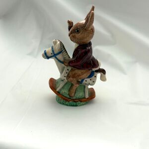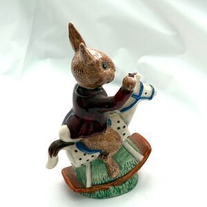 Royal Doulton Bunnykins “Tally Ho!” DB12 figurine, featuring a rabbit rider on a rocking horse. Made in England and issued by Royal Doulton Tableware in 1974, this piece also includes the Golden Jubilee Celebration 1984 commemorative backstamp. Hand-painted. Condition: Excellent—no chips, cracks, or repairs noted. Colors are vibrant and the glaze is glossy. Measurements: Approx. 4.5” tall. Stamped on base with original Royal Doulton marks.