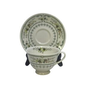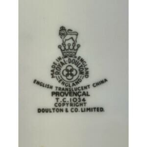 This Royal Doulton England 'Provencal' 1967-1997 Retired 5-piece place setting is in exceptional condition and perfect for collectors or anyone who appreciates fine china. Additional place settings are available with discount pricing saving up to 20% if purchasing multiple sets. The Provencal pattern features green scrolls with a floral center and rim with a classic, elegant look. This set showcases the timeless elegance and quality craftsmanship that Royal Doulton is known for. This 5-PC place setting includes the following: