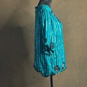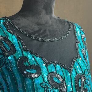 Royal Feelings Vintage Silk Sequin Beaded Top XL Teal Black Evening Party Blouse