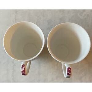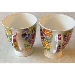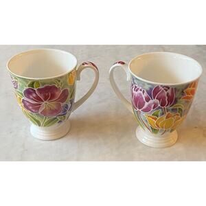 Fine bone china made in England. Etched watercolor style floral design. 1 cup has tulip and peonies, 1 cup has pansies. White background.