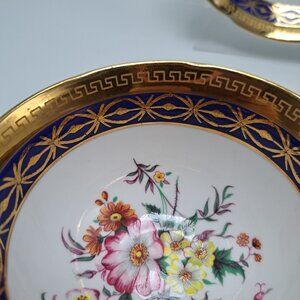 Elegant teacup and saucer set featuring intricate floral patterns and gold trim. Ideal for collectors or tea enthusiasts.