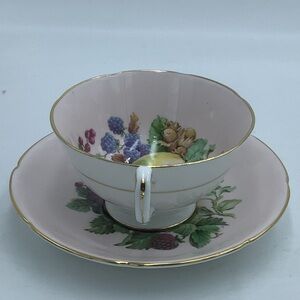 Royal Grafton fine bone china, pale pink footed teacup and saucer featuring a strawberry and fruit design and gold trim. Pre-owned, good condition.