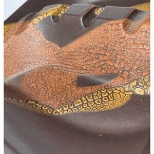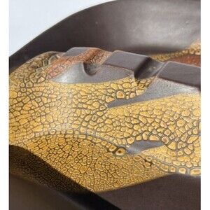 Royal Haeger #2094 Mid Century Modern Brown & Yellow Snakeskin Ashtray. Cool, earthy colors. Dominant color is a rich brown. Accent colors are a mustard yellow and an orange/brown. Crackled, snakeskin finish. Pattern looks kind of like flames. ***There is a chip on the bottom of this ashtray that is barely visible from the top (see photos).