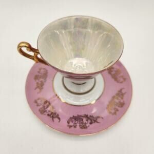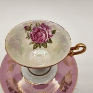 Royal Halsey Vintage Lusterware Pedestal Rose Tea Cup And Saucer Pink Gold