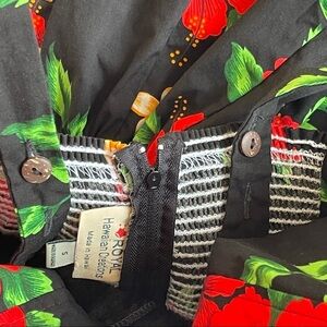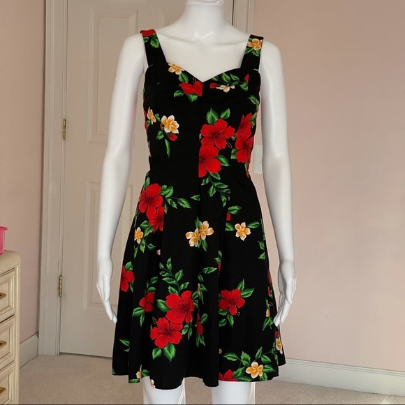 Excellent condition. Royal Hawaiian Creations Fit and Flare Retro Floral Dress. Size: Small. Color: Black/Red/Multi