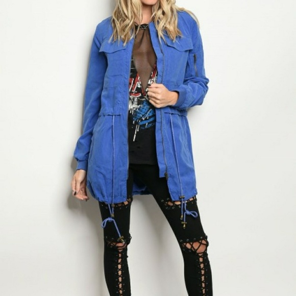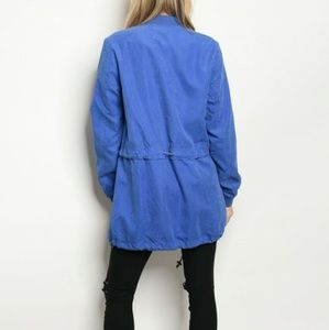 Long sleeve long line utility jacket with a mock neckline.