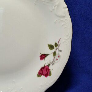 This plate is part of the large Red Roses Collection by Royal Kent. The description of the pattern is red roses, embossed, scalloped, gold trim. This pattern is retired. This collection was made in Poland.