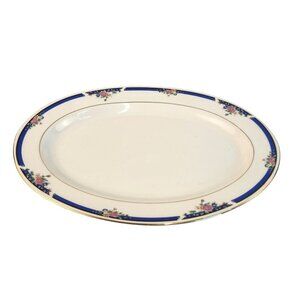 This stunning Royal Majestic Fine China "Morning Rose 8433" oval serving platter is an elegant addition to any dining collection. Adorned with delicate floral patterns, a rich cobalt blue band, and accented with gold trim, this platter effortlessly exudes sophistication and charm. Its versatile 14" size makes it perfect for serving meals at celebrations, family gatherings, or formal dinners. Crafted with fine china, this vintage piece balances durability and elegance, making it a timeless centerpiece for your table. Elevate your dining experience with this exquisite piece of fine china.