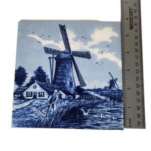 Royal Mosa Holland Delft Blue Tile Trivet Wall Hanging Windmill Farmer Birds