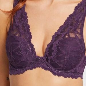 Botanical lace with metallic lured yarn and ultra soft velvet border. Foam cups, plunging neckline, stretch mesh