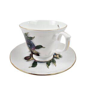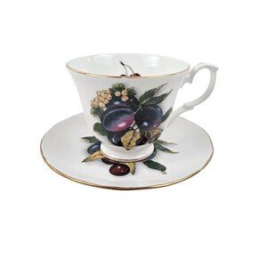 This elegant Royal Nobilta teacup and saucer set features a charming fruit design, perfect for afternoon tea gatherings. Made from fine bone china, it adds a touch of sophistication to any table setting.