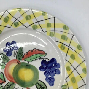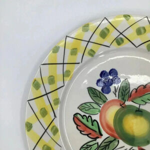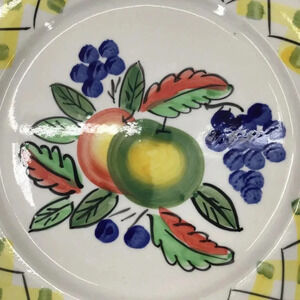 This is an 11" dinner plate from Royal Norfolk featuring fruits (apples, grapes) and a yellow basketweave rim. Hand-painted, dishwasher and microwave safe.