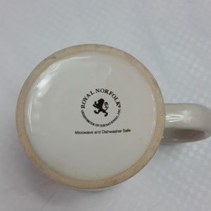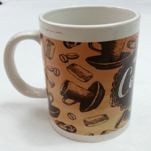 Mug with designs of coffee mugs, sandwiches, muffins and coffee beans