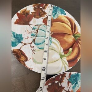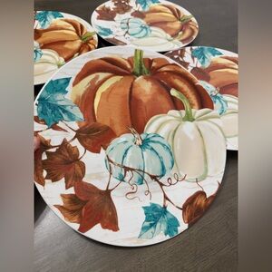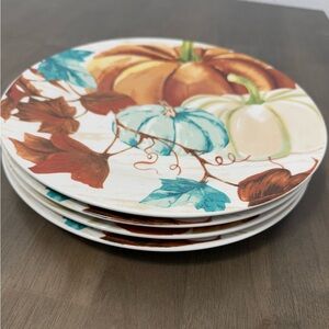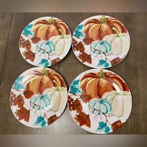 Set of four round plates featuring pumpkins and leaves. Perfect for fall decor. Royal Norfolk Dinner Plate Set of 4 Stoneware 10.5” Fall Pumpkin Pumpkin