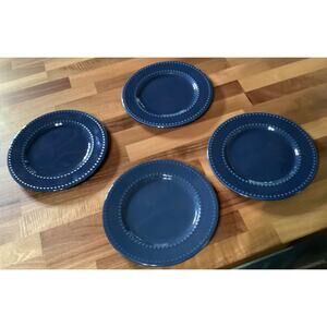 The Royal Norfolk Navy Blue Beaded Rim 7 5/8" Salad Plates Lot of 4 is a contemporary set of stoneware salad plates with a glossy finish. The blue color and beaded rim give these round plates a stylish and unique look, perfect for all occasions. Manufactured in China in the 21st century, these plates are machine washable and have a printed backstamp. The set includes four decorative and functional salad plates from the Royal Norfolk brand, making them a great addition to any dining table for teens and adults alike.