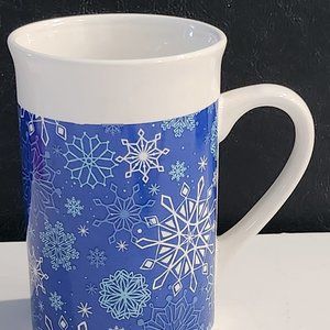 A nice new in the box royal Norfolk Blue and white snowflake design Christmas ceramic mug. Holds 12 fluid ounces. Microwave safe dishwasher safe. Non smoking pet free home.