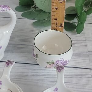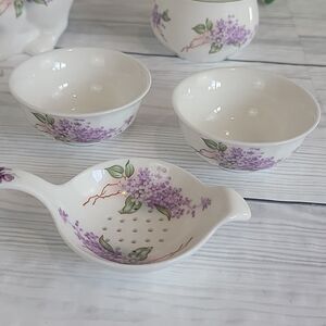 Adorable vintage whimsical cat creamer with sugar bowl in fine bone china by Royal Patrician with a rare lilac pattern. Included are two Allyn Nelson fine bone china tea strainers and drip bowls with matching lilac patterns. All in great pre-owned condition with no chips or cracks.