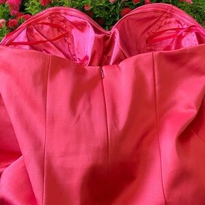 Features a strapless sweetheart neckline with soft cup padded inserts and a figure hugging mermaid silhouette. Satin style scuba stretch fabric in a gorgeous coral pink shade. This gown has an elasticated hem that helps hold the structure of the dress while moving. Zipper at back. Fully lined. Good preowned condition, no notable flaws.