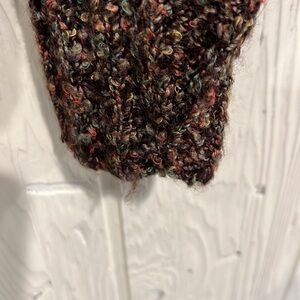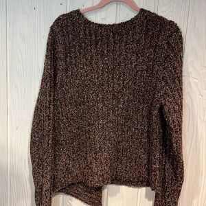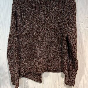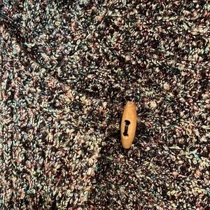 Royal Robbins cardigan sweater with an uneven hemline. It features an inside button and an outside barrel button closure. No size is indicated. Oversized fit.