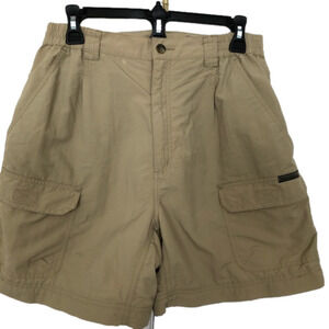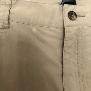 Excellent condition except for small spot shown in pictures. Elastic and button waist plus belt loops. Five pockets outside and one hidden inside.