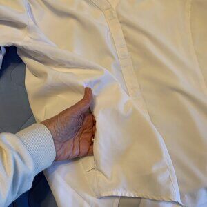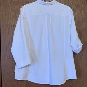 Excellent condition. 3/4 sleeve can be rolled and secured up, snaps vs buttons on front, one zippered side pocket, lightweight, quick dry
