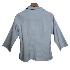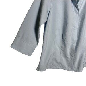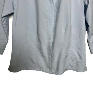 The Royal Robbins shirt for women in size Medium is a sky blue long sleeve button-up designed for outdoor activities like hiking. Made from Cool Max Alta Polyester ripstop fabric, this lightweight and breathable shirt features a collared neckline, 3/4 sleeves, and a button closure. With a solid pattern and easy-care instructions, this shirt is perfect for travel, casual wear, or workwear in any season. Additionally, it includes a zip side pocket for added convenience during outdoor adventures. Perfect for nature lovers and those who enjoy outdoor activities, this classic and versatile shirt is a must-have for any wardrobe.