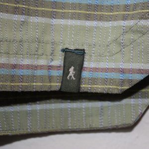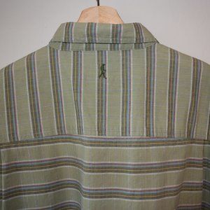 Hit the trailhead in style. Royal Robbins has a reputation for quality outdoor clothing. This olive green short sleeve with horizontal candy stripes is no exception. With embroidered logos on the center of the upper back and lower left hem and stitched accents throughout, this piece lets you stride in style.