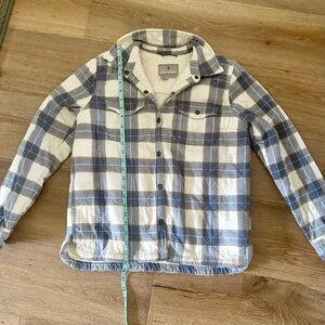 This jacket is the best!! Soft blue and cream plaid. Cozy Sherpa inside