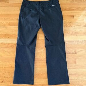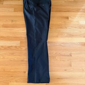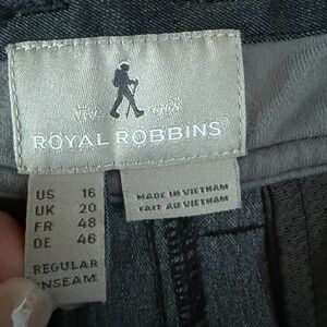 Royal Robbins Travel Hiking Pants Womens Size 16 Dark Charcoal Gray. Heavier grade fabric than most lightweight, quick dry hiking pants. 66% nylon, 31% polyester and 3% spandex. Flat front with side pockets and a hidden zipper pocket on right hip (pics 8, 9.) Back hip pockets with button closure. Belt loops. Color of pants is dark charcoal gray; pics were taken in sunlight and show the pants to be lighter than actual color. Like new, excellent condition. Size 16.