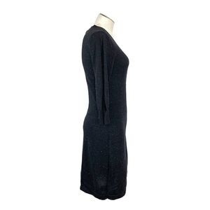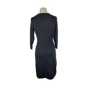 3/4 sleeve v-neck below knee sweater dress with ribbed waist detail in a black lightweight cotton blend knit festooned with multi-colored confetti like specs.