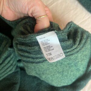 A warm, cozy hooded sweater from Royal Robbins made of a thick wool blend. Kangaroo pocket in front with cute tuxedo stripes knitted down the sides. Fitted but not tight; you can easily wear a long-sleeve underneath. Worn as a base layer for winter sports, or just a comfy leisurewear item. Good quality; it'll last you awhile!