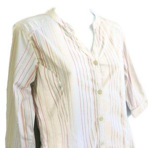 Royal Robins Hiking Shirt. Princess Seams. Stripes. Stretch. Hiking. Mesh Back Lining and Shoulder Vents for extra breath ability. Split Neck. Secure Zip Pocket. Made in Vietnam. Machine Wash. Measures US Size Small.