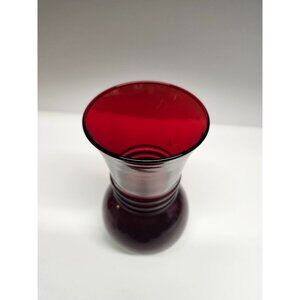 Mid Century Royal Ruby Red Anchor Hocking vase. Roly poly bottom, banded middle, flared top. Excellent condition. No chips, cracks, or rough edges. aka Christmas red plates, released as a limited edition at the holidays. Produced from the late 1930s - 1960s. Measures 6.5" tall, 3" across at the top opening.