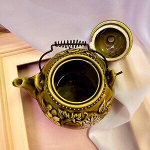 ITEM: 1 Vintage Ceramic Teapot. Mid-Century with Autumn Fruits & Daisy-like Flowers, Glazed with 3 feet on the base. Coiled metal handle.