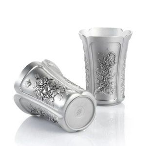 Sculptured in a classic oriental style, this pair of flower-like tumblers features intricately crafted blooms of the four seasons - the Tree Peony for Spring, Lotus for Summer, Chrysanthemum for Autumn, and Plum Blossom for Winter.