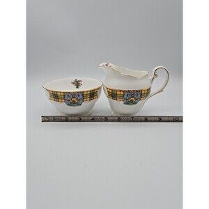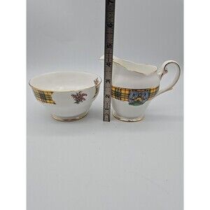 The Royal Standard Bonnie Scotland Clan Macleod Creamer & Open Sugar Bowl Set is a charming addition to any kitchen or dining room. Made of fine bone china, this multicolored creamer and sugar bowl set features a beautiful Bonnie Scotland pattern, adding a touch of elegance to your table setting.