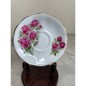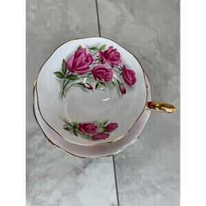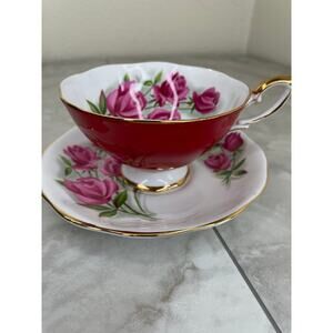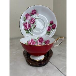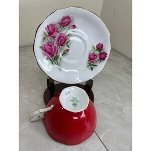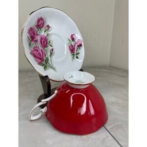 Elevate your tea time with this charming Royal Standard tea cup and saucer set! Featuring a delightful red and pink floral design, this duo brings a touch of elegance to any occasion. While not originally a set, they complement each other beautifully.