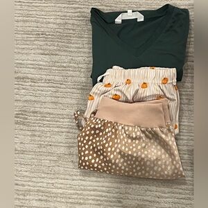 All items size small except for last column (green top, pumpkin shorts, and brown shorts). Green Top size XS, Pumpkin Shorts XS, and Brown Shorts Size Medium