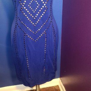 Make a statement in this captivating 36" V-neck bodycon dress that effortlessly marries sophistication with bold style. The striking blue hue sets the stage for a dazzling display of elegance. Adorned with a meticulously arranged array of gold studs, this sleeveless dress boasts a stunning pattern that accentuates the silhouette, creating a mesmerizing visual allure. The body-hugging design offers a flattering fit while the zipper at the back ensures effortless wear. With its chic blend of gold studs and a sleek silhouette, this dress exudes an undeniable charm, making it the perfect choice for a night of glamour and allure.