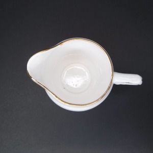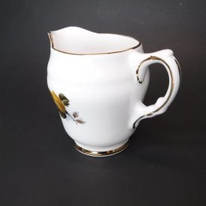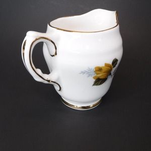 Design: Delicate white creamer with a yellow rosebud. Gold trimmed. This would match Royal Grafton's White & Yellow roses pattern. It is also a close match to the Adderley Yellow Rose Pattern.
