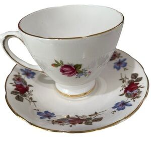 Royal Sutherland Teacup and Saucer, made in Staffordshire England. Beautiful fine bone China teacup and saucer with pink and red roses and greenery. Excellent condition